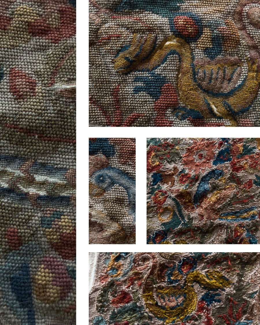 The silk stitches have disappeared almost entirely - silk is more vulnerable to wear than wool - but the wool has survived with its colours stable.
