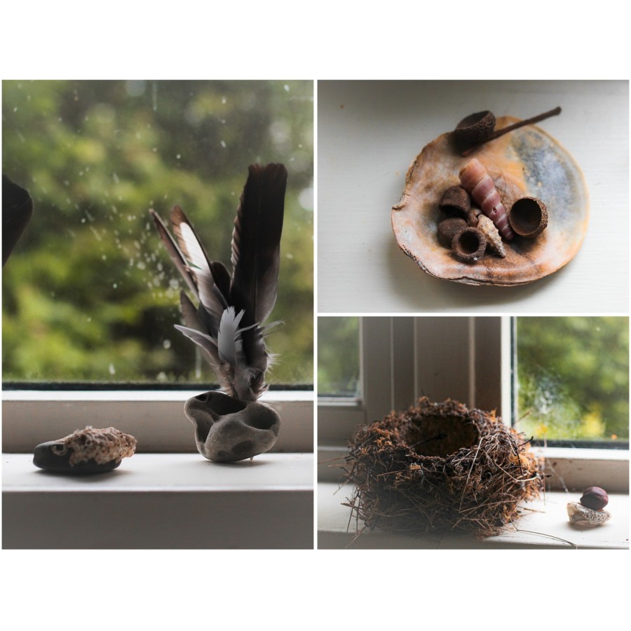 There are bird skulls – I find them when I’m walking, and I bring them home and clean them carefully, and they sit on my shelves like small sculptures. There are nests that have blown out of trees in winter, abandoned, no longer needed. There are stones from particular places, particular walks, particular days.
