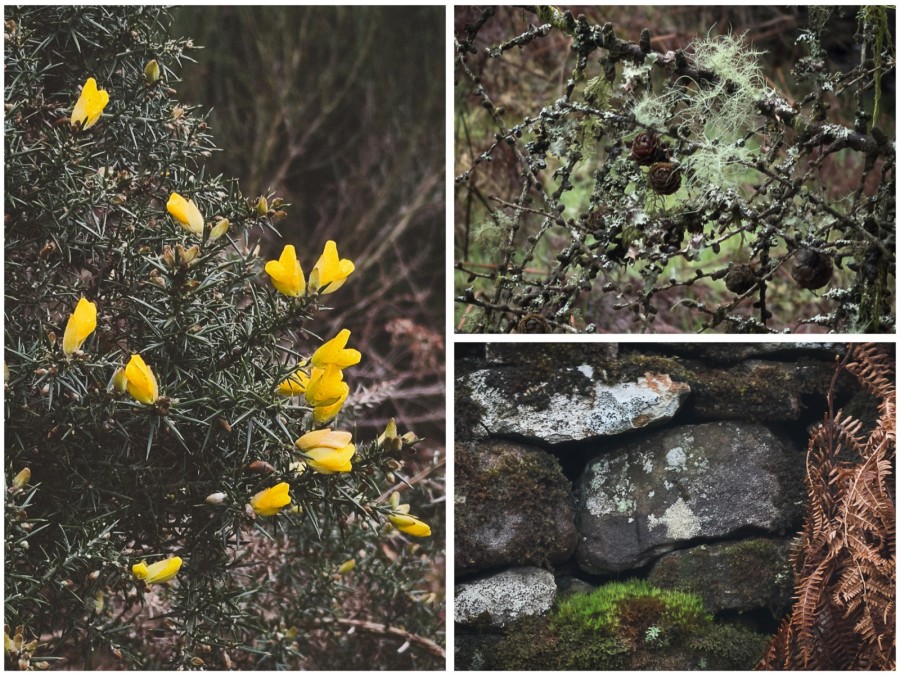 A walk in the forestry above Drymen on the winter solstice, though it feels more like autumn with bracken still rust-coloured and gorse blooming yellow against the dark pines.
