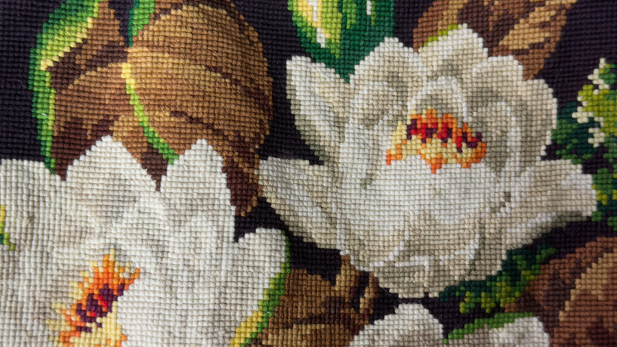 The needlepoint is Berlin wool work, mid-to-late Victorian. The flowers are either water lilies or magnolias. I genuinely couldn’t decide when I first got it, and I’m still not entirely certain. (One of them might be a water lily. The leaves on the others are very definitely magnolia.) It doesn’t matter enormously. What matters is that someone spent a long time on it, stitch by stitch, working from a chart, and the result is quite beautiful.